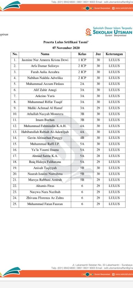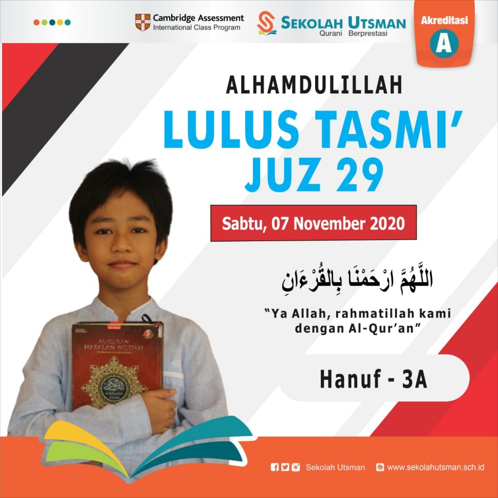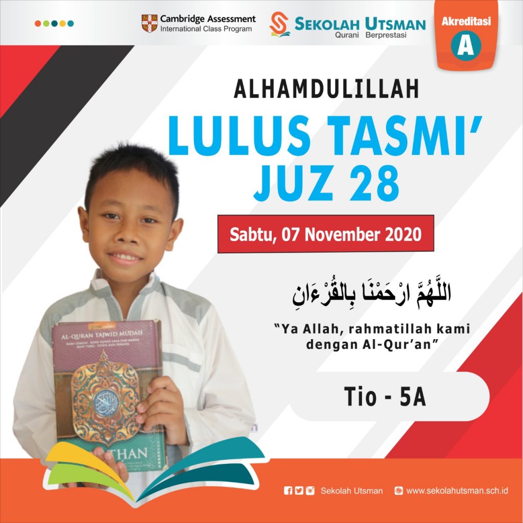Pada Sabtu, 7 November 2020 Sekolah Utsman telah menyelenggarakan Program Tasmi’ 1 juz. Memang Target Tahfidz jenjang SD adalah minimal 2 Juz yaitu juz 30 dan 29, namun banyak siswa yang meraih melebihi 2 juz.